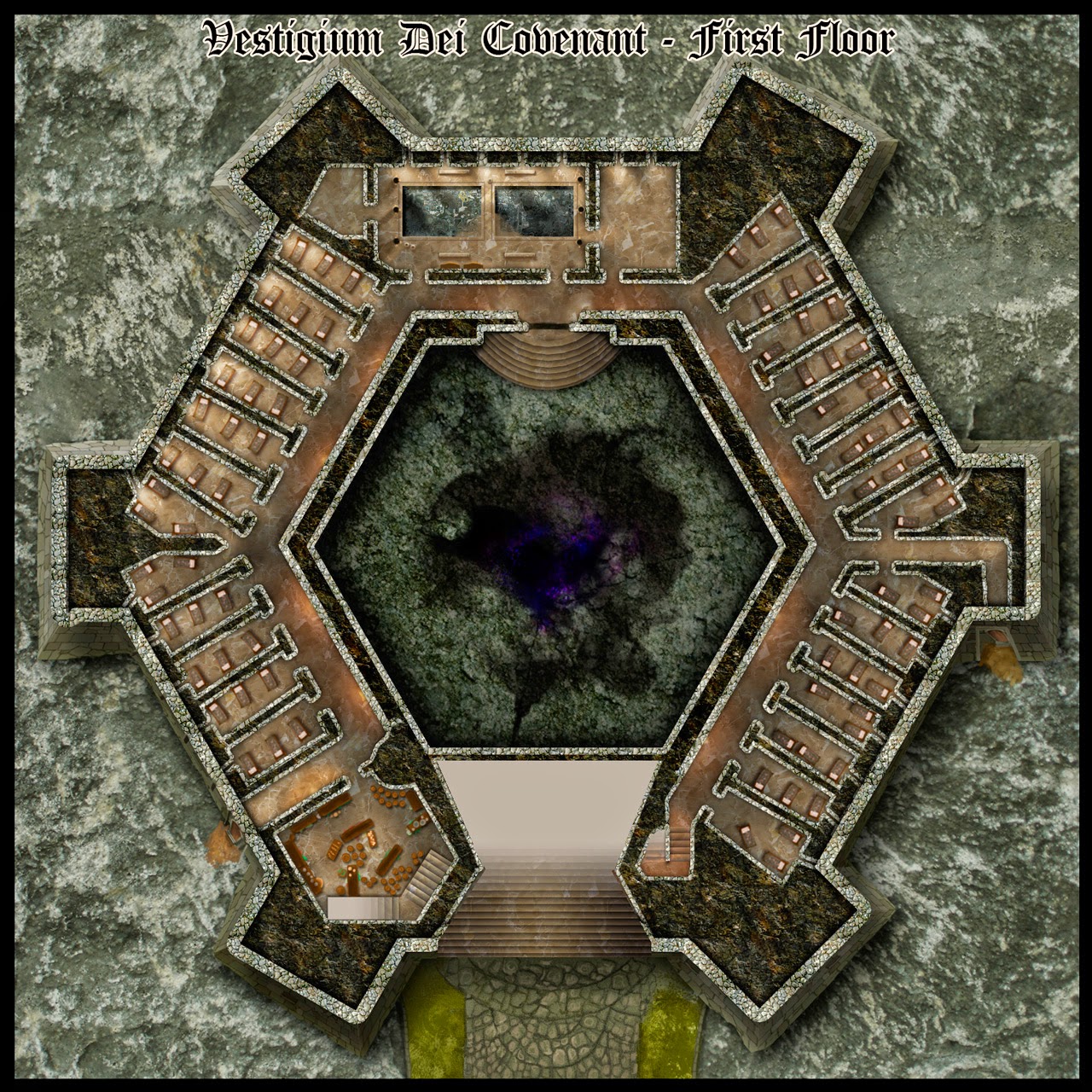 The first floor is a stone foundation in order to hold up the floors on top. The grounds are a mostly bare and scratched stone because the covenant is located in the center of a crater which hasn't had enough time to recover a top-soil. The magi discussed performing magic to accelerate the process but the decision ultimately came to putting their farmlands out past the rim of the crater. Easier but more vulnerable to supply disruption.